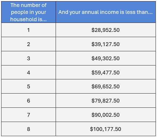 Anyone who qualifies for government assistance (WIC, EBT, disability) is welcome to purchase a CSA share at a reduced price. You are also eligible for a reduced-price share if your household income is equal to or below the amount indicated in the chart (185% of the 2025 Federal Poverty Guideline). "Household" is defined as the persons living with you with whom you share your food budget.