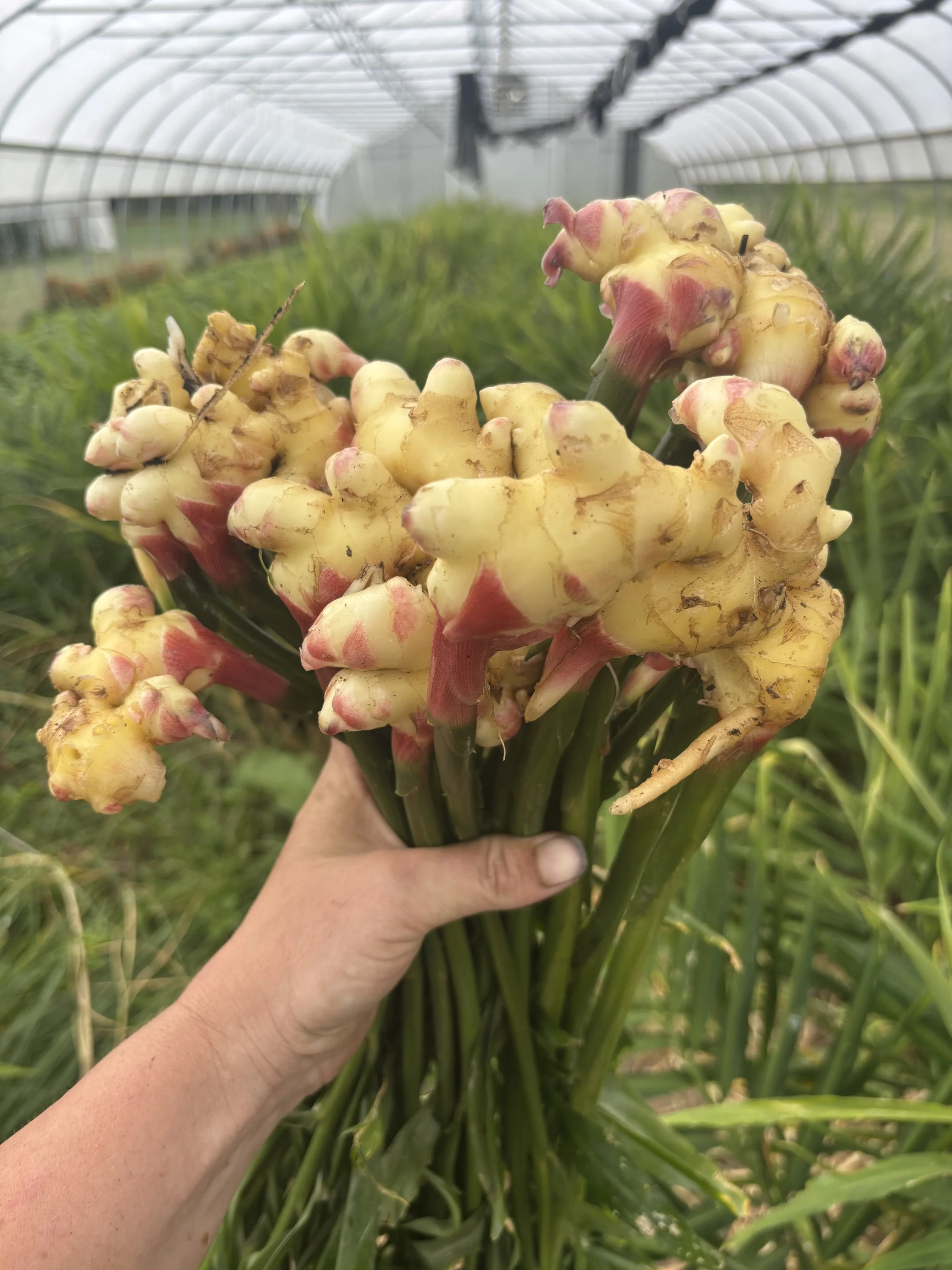 As we settle deeper into fall, the treats just keep coming. Fresh ginger remains plentiful in the tunnels, and we’re still seeing October cucumbers. They are the perfect crisp companion to your salad greens, and their vines have become a favorite resting spot for the local tree frogs.