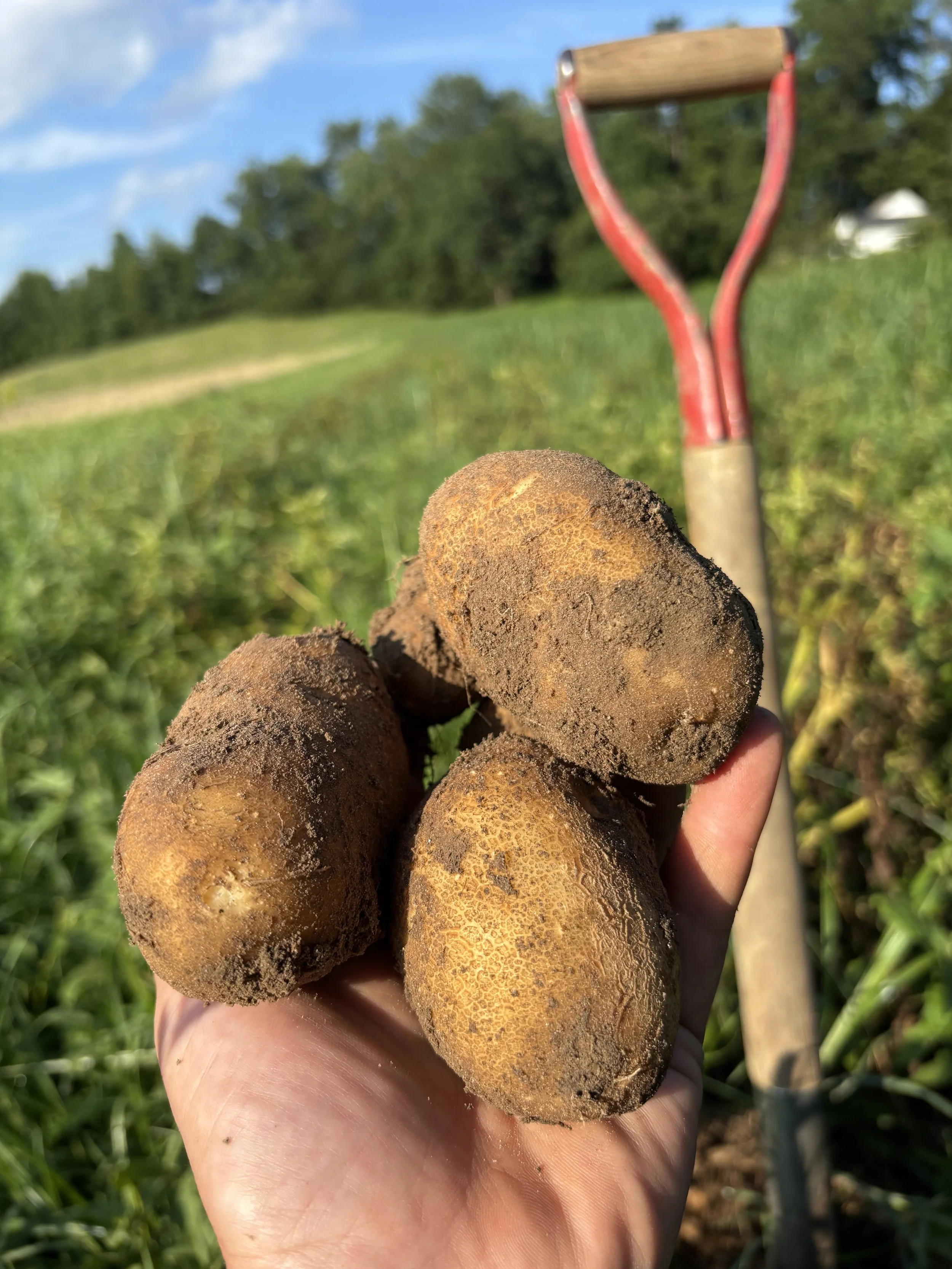 Another exciting crop we’re all looking forward to is potatoes. Last year we took a big hit with the drought and didn’t have the water capacity to irrigate every field. The larger fields, like potatoes, felt the pressure. But as many of you have also experienced along with us on these rainy weeks, we are not in a drought this year. Those spuds have definitely been getting the water they need, and the plants are looking phenomenal. Of course, we’ll know for sure once the flowers die back and we start digging and the harvest is weighed. Fingers crossed we didn’t get too much water.