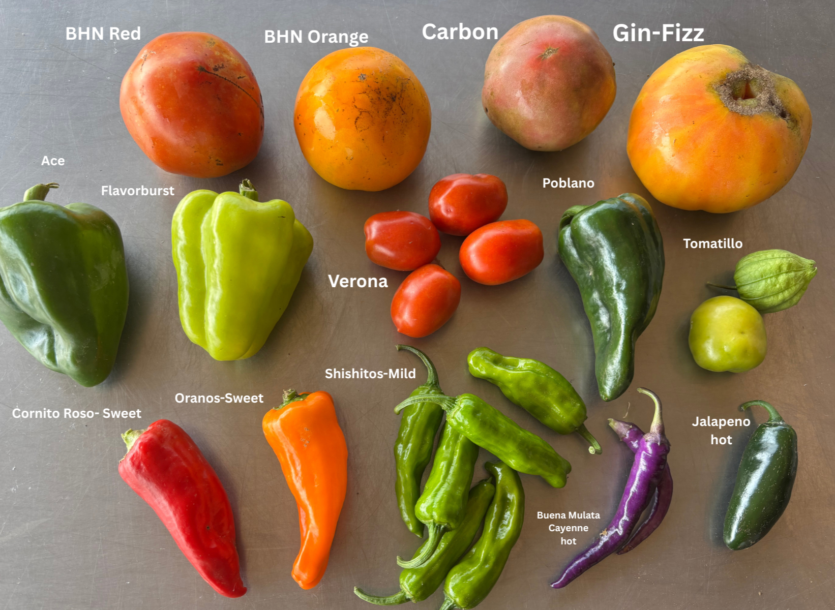 The varieties that have ripened are listed below; there will be a couple more later season varieties that are still to come. The only peppers that are generally picked green are the Jalapeno’s and Serrano’s which both will also ripen to red.
